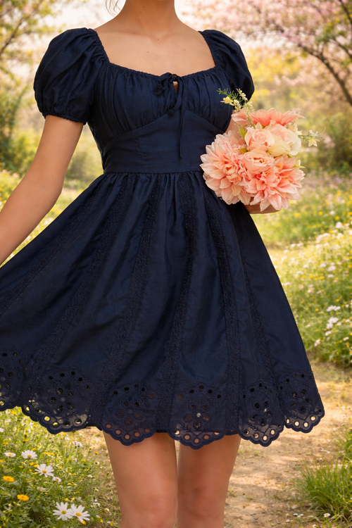 Darling Blue Embroidered Puff Sleeve Mini Dress